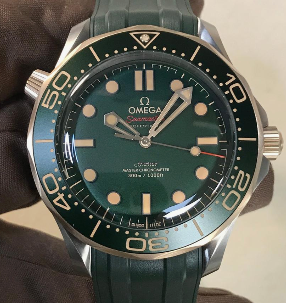 The watch is presented on an integrated green rubber strap with foldover clasp, and is driven by the OMEGA Co-Axial Master Chronometer Calibre 8806, which can be seen through the sapphire-crystal caseback.